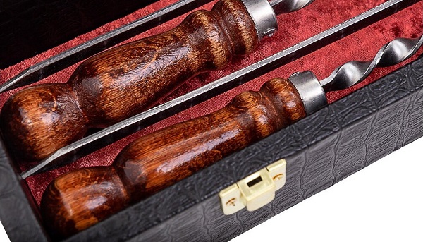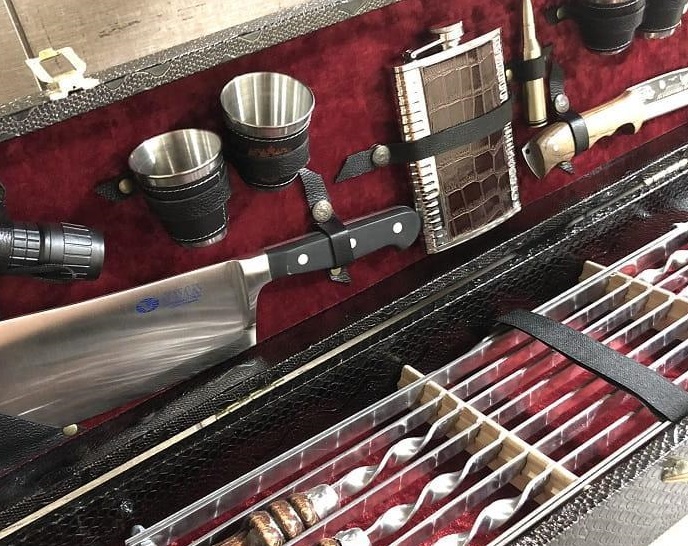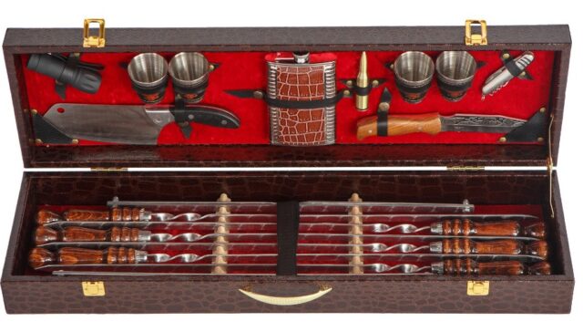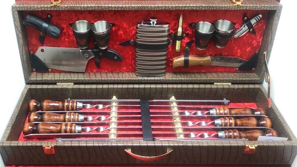 Материал: нержавеющая сталь, пластик, дерево, эко кожа. Изделия упакованы в чемодан.