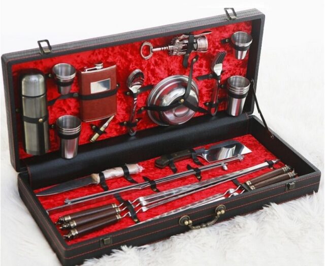 Компактный чемоданчик вмещает всё самое нужное на пикнике и станет отличным подарком. Этот оригинальный набор инструментов в удобном кейсе, станет просто незаменимым помощником для любителя барбекю.